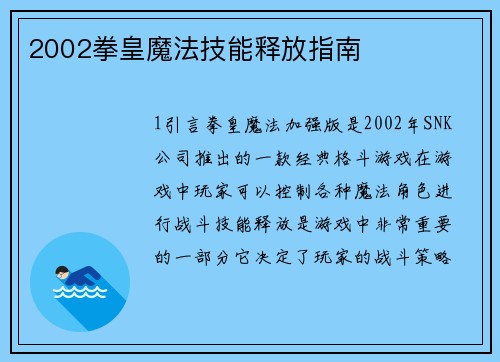 拳皇魔法加强版是2002年SNK公司推出的一款经典格斗游戏。在游戏中,玩家可以控制各种魔法角色进行战斗。技能释放是游戏中非常重要的一部分,它决定了玩家的战斗策略和胜负的关键。本文将详细介绍拳皇魔法加强版中技能的释放方式。